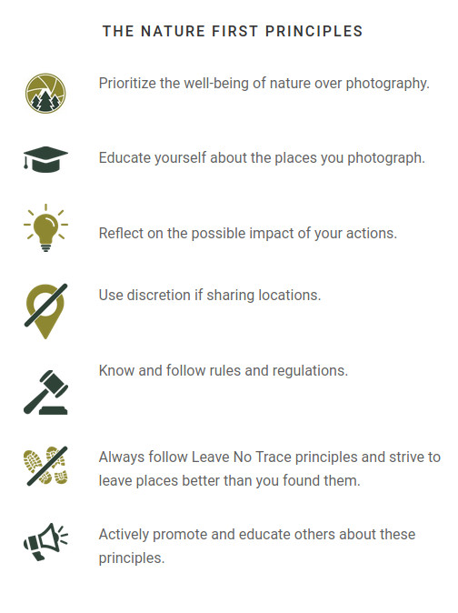 Nature First is built on seven core principles that help communicate how each of us can enjoy nature photography responsibly. The Seven Principles of Nature First Photography were developed to help educate and guide both professional and recreational photographers in sustainable, minimal impact practices that will help preserve nature’s beautiful locations.